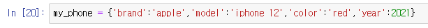 my_phone 에 key 값이 brand , model , color , year , value 값으로 apple ,iphone 12 , red ,2021이