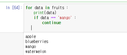 mango가 나오면 continue 키워드를 통해 이반복을 다음 반복으로 넘기게 됩니다.