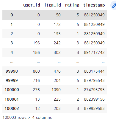 - u.data 는 컬럼명이 없이 있는 파일이기에 컬럼명을 지정해 읽어옵니다.