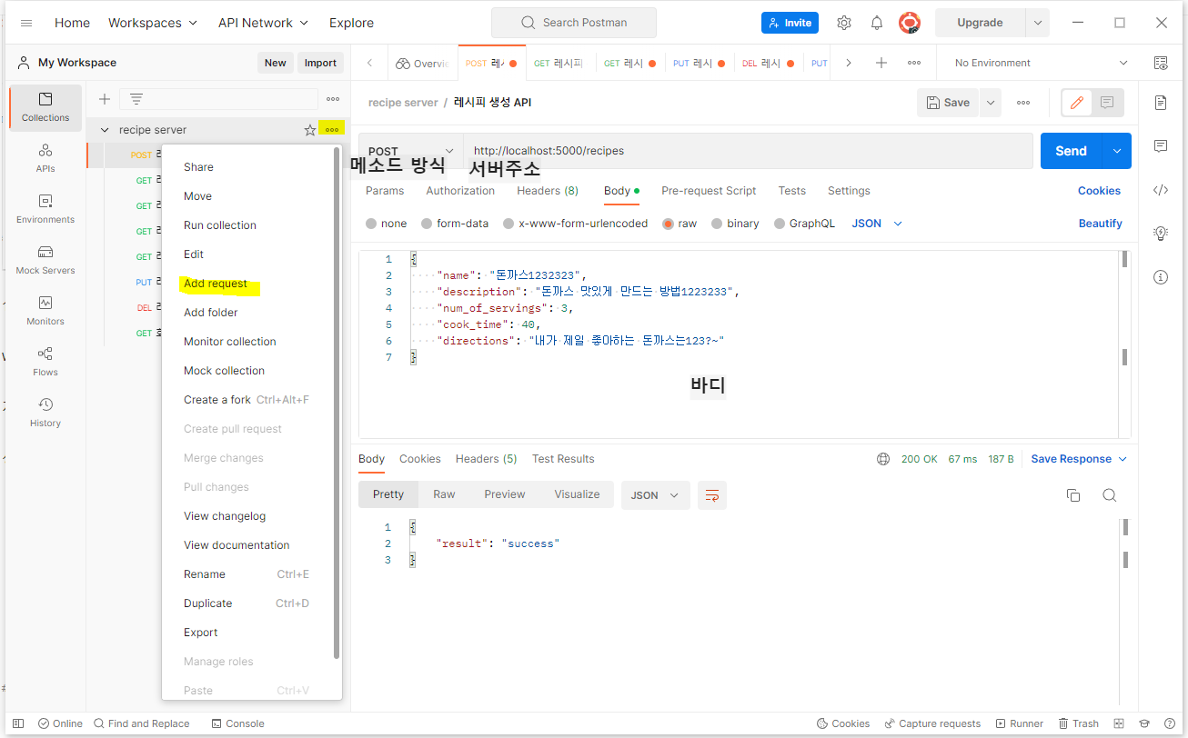 생성을 한 뒤 Collections 에서 새로운 collection을 생성하고 여기에 request 문서를 작성합니다.