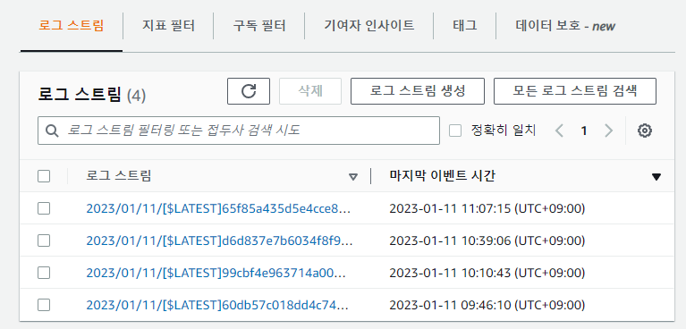 로그 스트림에서 에러가 있는 부분을 확인합니다.