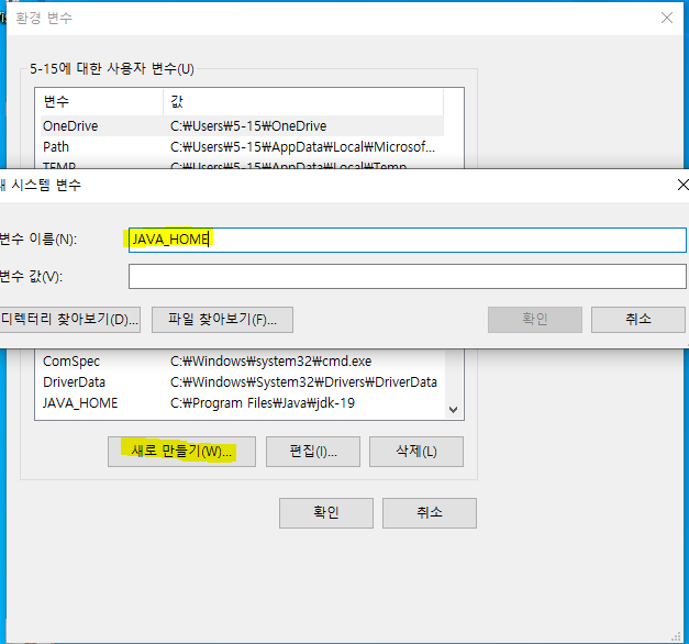 - 시스템 변수 에서 새로 만들기를 눌러줍니다.