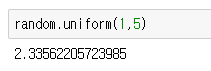 위 사진처럼 int형을 무작위로 내놓는 randint 와 float형을 내놓는 uniform 등등을 이용 할 수 있습니다.