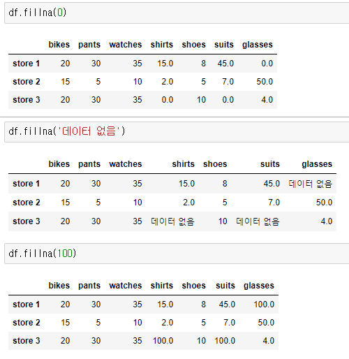 행을 삭제하지 않고 다른 값으로 대체하려면 fillna()를 이용한다.