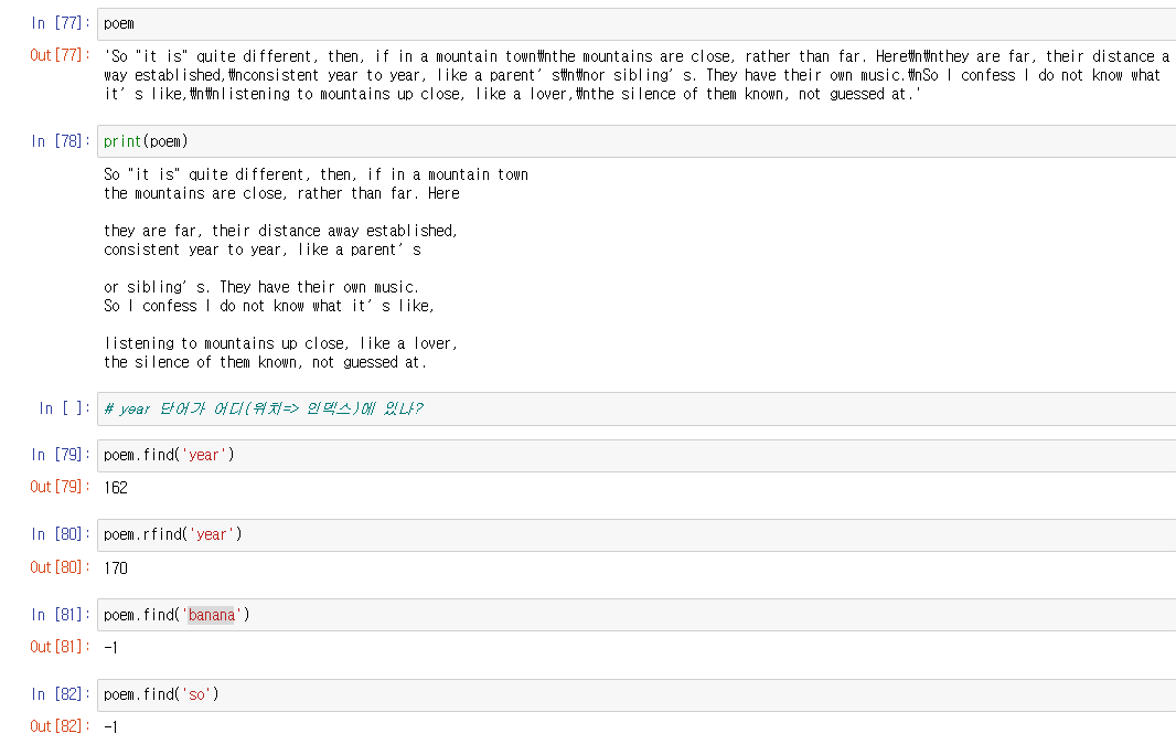 문장에서 특정 단어의 index 값을 알고 싶다면 find()와 rfind()을 이용한다.