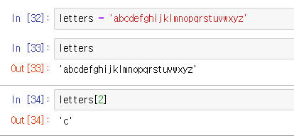 위 사진처럼 letters 변수의 3번째인 'c'에 접근하여 보여주는걸 알 수 있다.