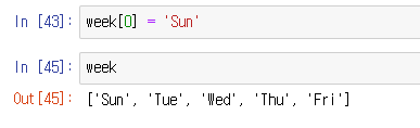 위 사진과 같이 week[1] 은 week list에 2번째 값인 'Tue'를 나타내게 됩니다.