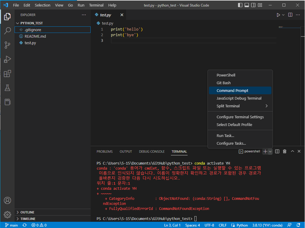 파이썬의 아나콘다 프롬프트에 다음과 같이 추가합니다.