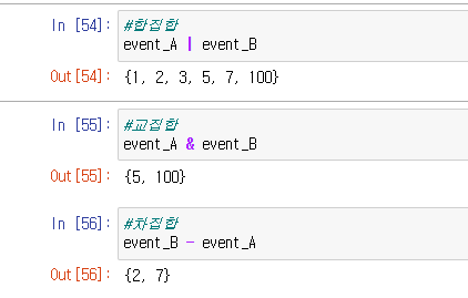 위 사진처럼 event_A와 event_B 의 합집합 {1,2,3,5,7,100} 이 출력되었으며
