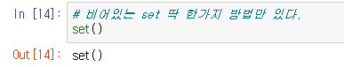 비어있는 set은 오로지 set()으로만 가능하며 기본적으로 생성할때에는 {}을 이용합니다.
