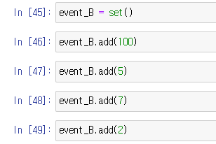먼저 event_A라는 빈 set을 만들어 add()을 통해 값을 계속 넣어주었습니다.