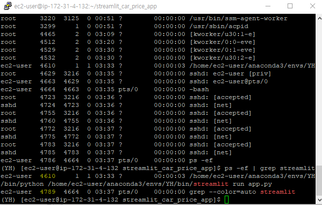 ec2 서버에서 --server.port 포트번호 항목을 추가하면 포트를 설정하여 접속할 수 있다. streamlit run app.py --server.port 8501 ec2에서 개방한 포트번호를 입력해야만 접속이 가능하다. 현재 방화벽 포트가 8501 하나만 열려있어 8501을 입력했으나 만약 8502로 접속할려고 하면 방화벽에 막히게 된다. 앞서 ec2에 자동으로 pull을 가져오도록 설정하였으나 streamlit은 바로 적용이 안된다. --server.runOnSave True 항목을 추가하면 작동하게 된다. nohup streamlit app.py --server.port 8501 --server.runOnSave True &